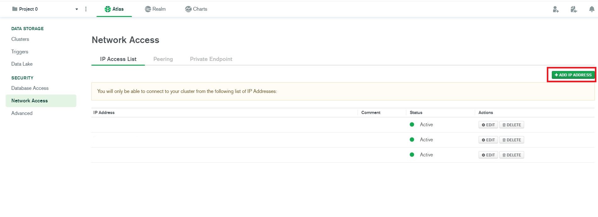 2. Network Access 클릭 후 ADD IP ADDRESS 버튼 클릭합니다.