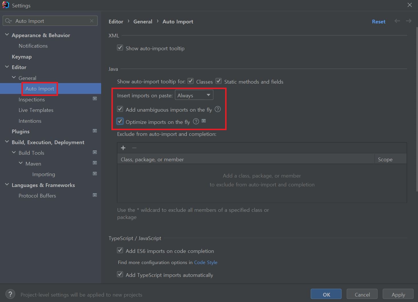 - Insert imports on paste : 복붙 시 임포트 여부 (Not, Always, Ask)